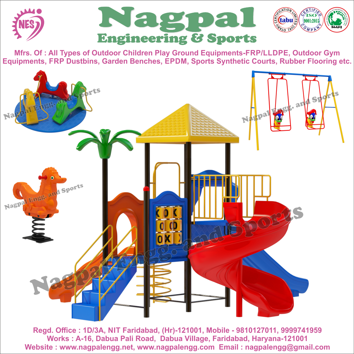 Nagpal engineering and Sports, continuously provide bigger, more fun play experiences for children across the country with our high-quality, commercial-grade school playground equipment. Our motto, "Big on Play … Low on Price, " guides us every day and helps us focus on our goal of providing affordable, durable children's playground Equipment for sale at great prices. You may ask, how do we do it? We provide endless opportunities for fun and play through our wide array of quality residential and school playground sets. Our commitment to quality ensures that kids get the most out of their playgrounds. We only use high-quality metal, plastic, recycled plastic, and Fiber glass moulded products for our park equipment and playground supplies. All of our heavy-duty plastic children's play equipment is made with standard UV inhibitors that increase the lifespan of the product and protect it from cracks and deterioration.