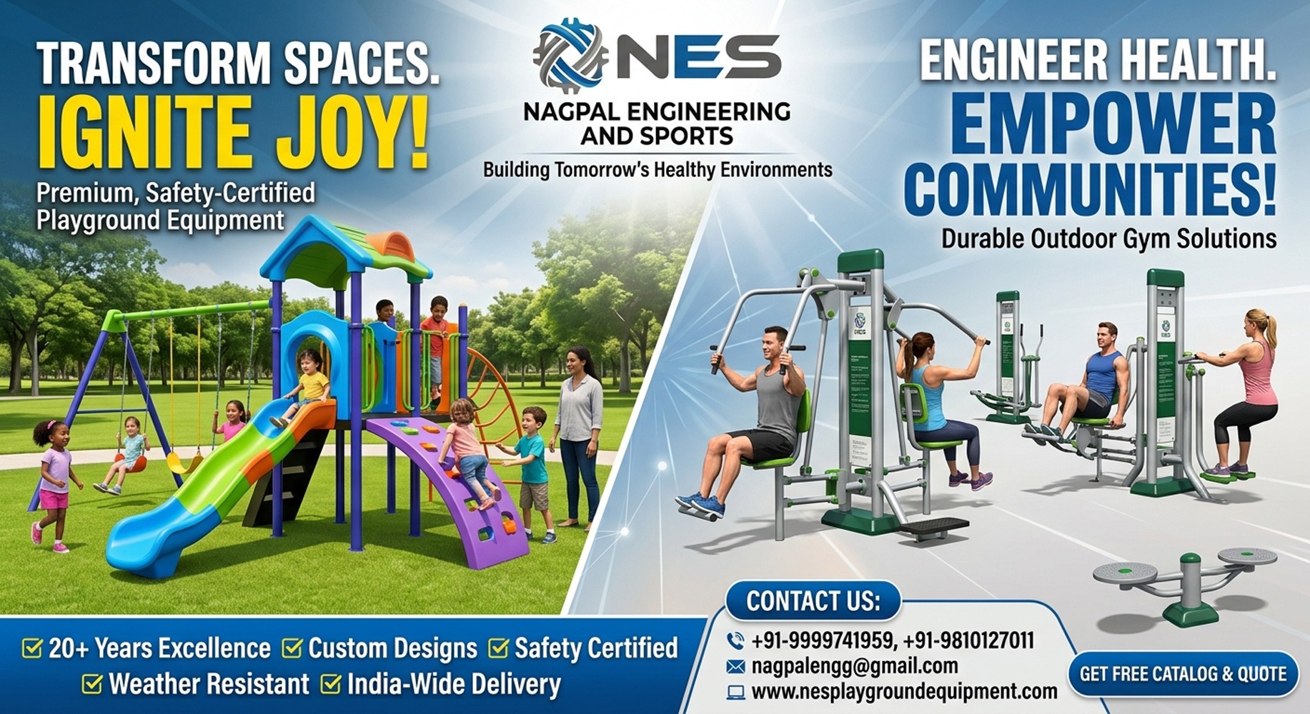 Are you looking to create a world-class recreational space? Whether it’s a vibrant school playground, a community park, or a high-end residential outdoor gym, Nagpal Engineering & Sports is your trusted partner for premium, safe, and durable equipment.