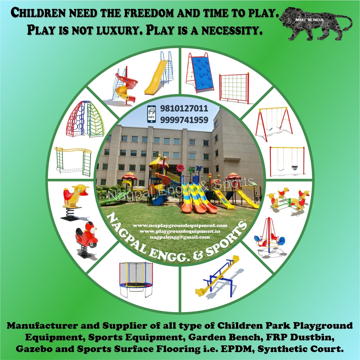 At Nagpal Engineering and Sports, we believe every child deserves a safe place to soar. With 30+ years of expertise, we manufacture heavy-duty, durable, and safe playground equipment that lasts a lifetime! ποΈβ¨