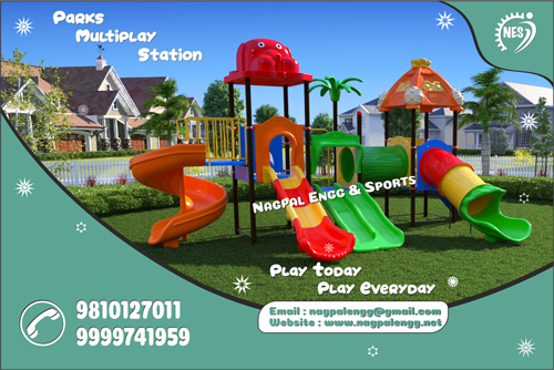 Nagpal Engineering and Sports is the leading Playground Equipment Manufacturer in India of quality Outdoor Children Play School Equipment to the highest safety standards. Wide Range of Products: Multiplay System, Double Swing, Circular Swing, Arch Swing, Wave Slide, Spiral Slide, Roller Slide, Tube Slide, Double Slide, Monkey Ladder, Jungle Gym, Bridge Ladder, See Saw, Turbo Tower, Spring Animals, Dustbin, Garden Bench, Outdoor Fitness Equipment etc
