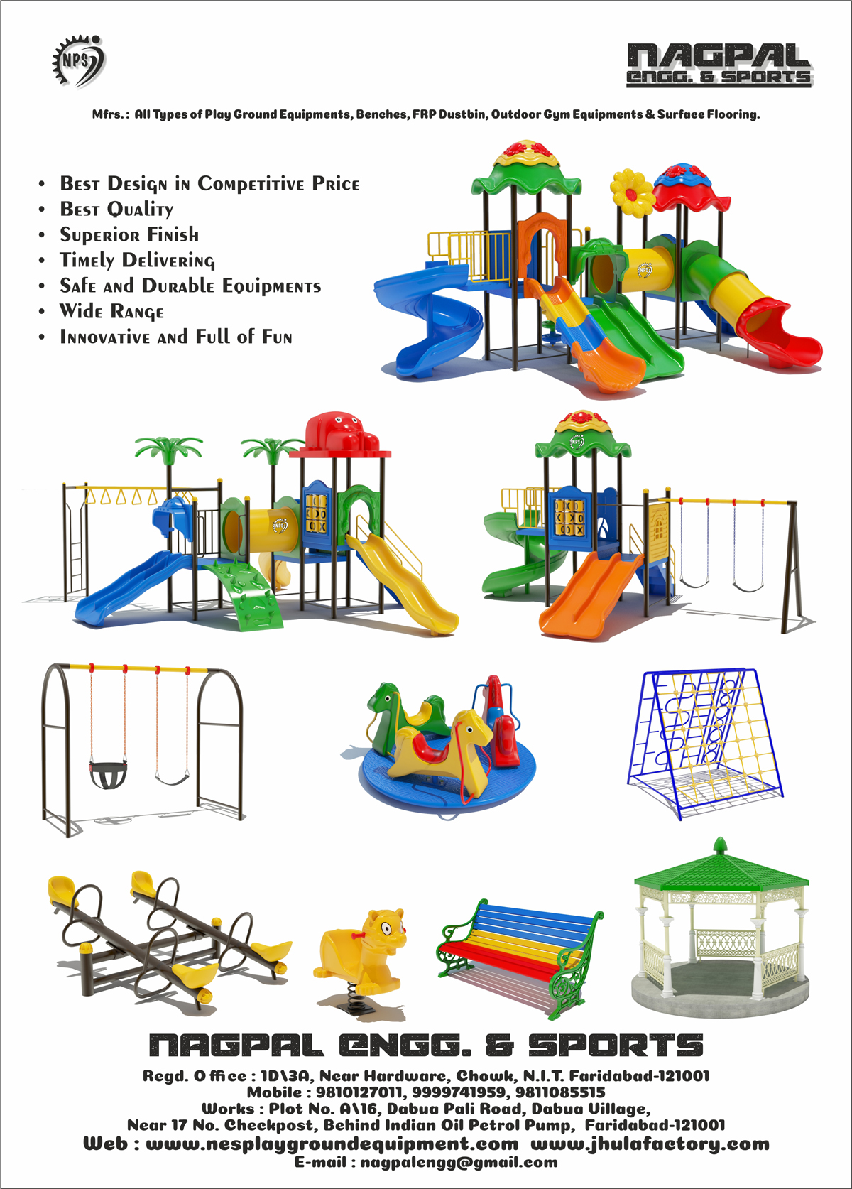 Nagpal Engineering and Sports leading manufacturer and Supplier of all types of outdoor children playground equipment from last 20 Years. Completed more than 100 projects in Children outdoor Playground Equipment. If you are looking for Children Playground Equipment for your park, Society contacts us for best deal. Call or WhatsApp : 9999741959, 9810127011 or email: nagpalengg@gmail.com