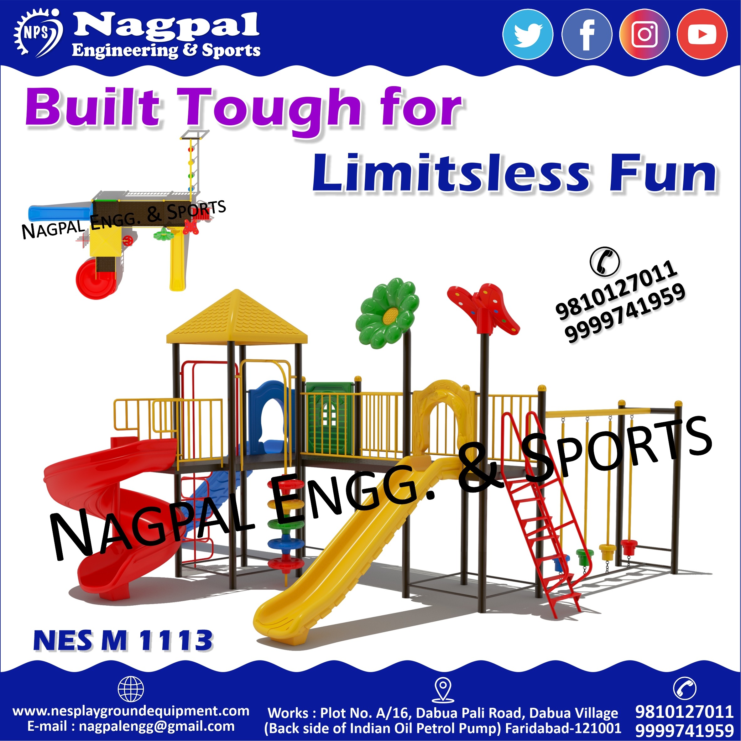 #PlaygroundEquipment #NPS #NagpalEngineering #OutdoorPlay #SchoolFurniture #IndiaBusiness #LandscapeArchitecture #SchoolInfrastructure #PlaygroundSafety #NagpalSports #B2BManufacturing #Multiplaysystem #Swing #SpiralSlide #Slide #MerryGoRound #Seesaw #Faridabad #Delhi #Noida #Ghaziabad #Palwal #Agra #Dwarka #Sonipat
