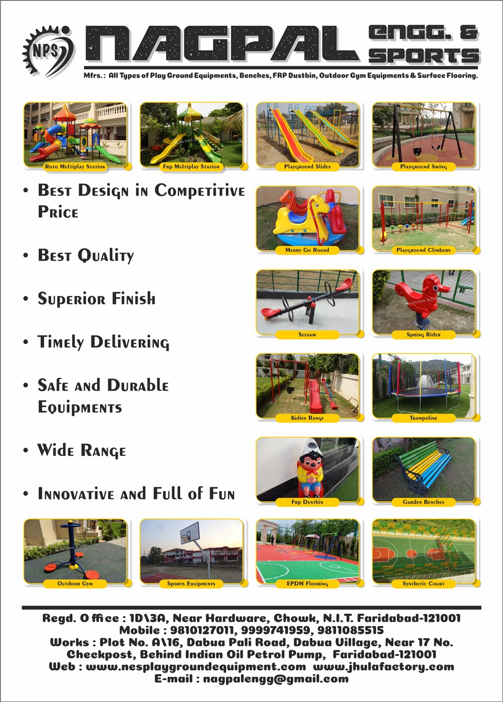 Contact Nagpal Engineering and Sports if you're looking for affordable, safe outdoor multiplay equipment for kids or outdoor park multiplay equipment. Being one of the top manufacturers of park multiplay equipment in Delhi/NCR, we offer a wide variety of outdoor multiplay systems that are made with their safety in mind. With the greatest materials and resources available, our manufacturing facility can provide reliable playing solutions for parks, gardens, schools, and more. Our selection is enticing and provides your young toddlers with the greatest experience.