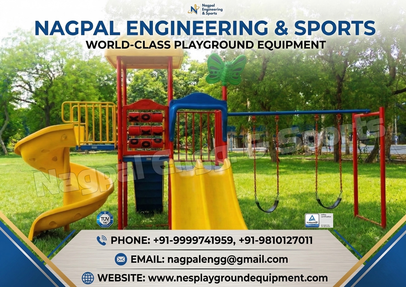 Multiplay System - FRP Product Code: NPS 4588 Product Size: 22 x 14 x 12 Feet Required Area: 30 x 20ft Consists: Antiskid Glass Fiber Platform with Roof - 01 Nos, Antiskid Glass Fiber Platform - 01 Nos, Glass Fiber Spiral Slide - 01 Nos Glass Fiber Double Slide -01 Nos Swing Two Seater - 01Nos, Antiskid Glass Fiber Ladder with Metal Railing -01 Nos, Tic Tac Railing - 01 Nos, Fancy Butterfly - 01 Nos Capacity: 10-15 children's