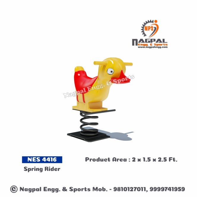 Spring Rider - Duck (LLDPE/FRP) Product Size: 2 x 1.5 x 2.5 Ft Product Code: 4416 Base: MS Plate 5 MM Duck: FRP/LLDPE MOQ: 05 Pcs Spring: Dia 6 inch, H-12inch 22 MM MS Rod Spring riders help children: Develop balance and coordination: When children sit on a spring rider, they learn to keep their bodies balanced, so they don't fall off. They also learn to use different body parts simultaneously, developing coordination skills.